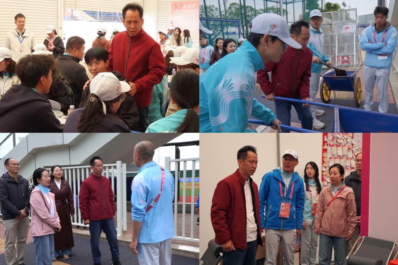 谢锦群深入赛事引导、信息咨询、后勤保障、应急处理等多个志愿服务点位,实地察看志愿者工作环境,详细了解各岗位具体职责与工作流程,与志愿者们面对面亲切交流。期间,谢锦群与十五运会棒球项目竞赛处处长丁峰、团中山市委青少年社会工作指导中心主任蔡刘建围绕志愿者服务成效、岗位协同保障等进行深入交流。丁峰和蔡刘建对我校志愿者展现出的专业素养和责任担当给予肯定,他们表示,理工“小海豚”的规范服务为青少年志愿服务树立了良好榜样。