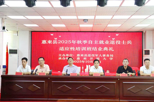 10月13日,由惠来县退役军人事务局主办、惠来开放大学承办的2025年秋季自主就业退役士兵适应性培训班结业典礼在惠来开放大学举行。县退役军人事务局局长郑钦镇,惠来开放大学校长方武福,以及县局、学校相关领导出席活动,县退役军人事务局副局长韩宏森主持活动。