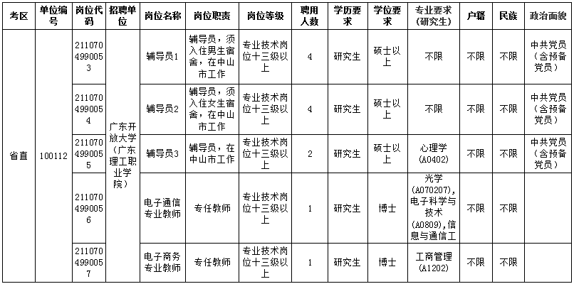 2.经省人力资源社会保障厅统一招募的服务期满考核合格的广东省“三支一扶”高校毕业生及具有本科学历、学士学位的退役大学生士兵参加考试的,不受岗位户籍条件限制。