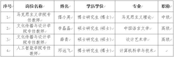 根据《2023年星空网页版登录入口(广东理工职业学院)人才引进公告》的有关规定,经报名、资格审查、考核、体检、考察等工作环节,拟聘用傅小英、李晶晶、薛青等4人为星空网页版登录入口(广东理工职业学院)事业单位工作人员,现予以公示。
