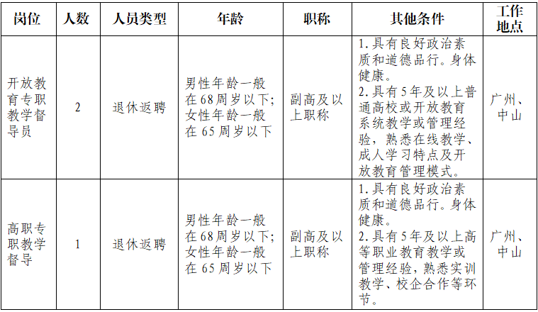 (二)岗位不接受本校退休人员申报。开放教育教学督导岗位仅接受广东省内院校退休人员申报。